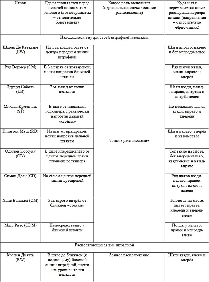 Также неэффективными против коллектива Ф. Клемана являются стандартные положения. Так, например, с корнеров получается довести дело хотя бы до удара лишь в одном из десяти случаев. Подавать для такой цели необходимо в область около дальней «стойки». Конкретнее – на участок в 3 метрах кзади и 5 м. в центр от соответствующего угла площадки голкипера. Там находящемуся под присмотром К. Маты игроку нужно постараться пробить головой в любую точку «рамки», кроме дальней «девять». Помимо этого, для разработки плана по огорчению бельгийцев с угловых, стоит учитывать и расположения их футболистов до исполнения рассматриваемого «стандарта», а также передвижения данных игроков после старта розыгрыша мяча. Детализация такой информации приведена ниже: