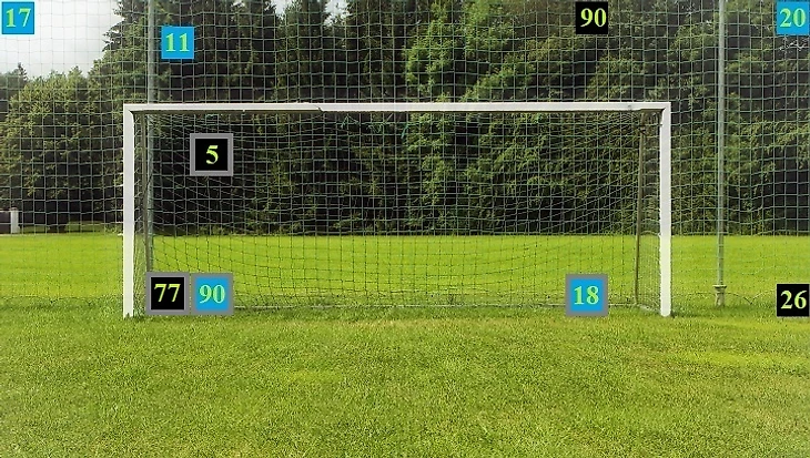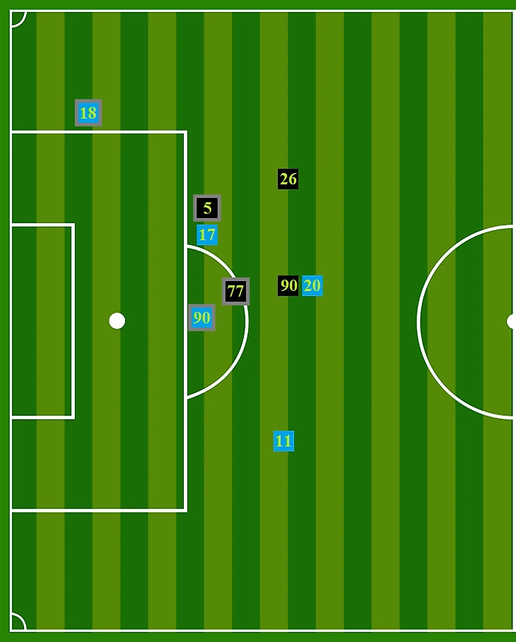 Расшифровка условных обозначений: 1) квадраты указывают на конкретные точки газона, с коих производили удары из-за штрафной площадки визави «Брюгге» (первая схема), и отношение данных «выстрелов» к створу ворот чёрно-синих или областям возле «рамки» (вторая картинка); 2) цвет фигур свидетельствует о видах моментов, при которых были нанесены такие удары: голубой – в позиционном нападении, чёрный – вслед за ошибками бельгийских оборонцев; 3) числа внутри четырёхугольников соответствуют игровым номерам футболистов Филиппа Клемана, разрешивших пробить по их воротам издали: 5 – Одилон Коссуну, 11 – Диатта, 17 – С. Дели, 18 – Рикка, 20 – Ванакен, 26 – Ритс, 90 – Де Кетеларе; 4) серая окантовка квадратов означает попадание в створ.