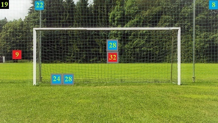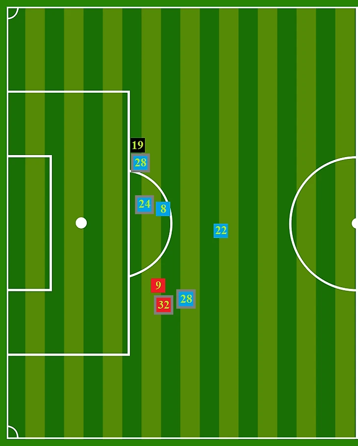 Расшифровка условных обозначений: 1) квадраты указывают на участки газона, откуда германцами совершались дальние «выстрелы» (первая картинка), и отношение их к створу ворот противников немцев или областям возле «рамки» (второй рисунок); 2) цвет фигур свидетельствует о видах моментов, когда производились данные удары: голубой – в позиционном нападении, красный – во время «контр», чёрный – вслед за оплошностью защиты соперника; 3) числа внутри четырёхугольников соответствуют игровым номерам представителей команды Л. Фавра, бивших по чужим владениям с дистанции: 8 – М. Дауд, 9 – Эрлинг Холанд, 19 – Юлиан Брандт, 22 – Джуд Беллингем, 24 – Т. Менье, 28 – Витсель, 32 – Джованни Рейна; 4) серая окантовка квадратов означает попадание в створ.