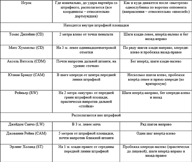 Наконец, самым нечастым и абсолютно бесполезным до настоящего времени способом угроз чужим владениям для подопечных Люсьена Фавра остаются штрафные удары. В последнее время в играх немцев возникала только пара таких моментов. И лишь однажды у вице-чемпиона Германии получилось произвести хоть сколько-нибудь опасный «выстрел» в данных обстоятельствах. Это произошло, когда к мячу подошёл Р. Геррейру. Португалец расположился на два метра вправо и 5 м. кзади от игрового снаряда. Затем Рафаэл с левой ноги послал мяч над «стенкой» визави, целясь в ближнюю «девятку». Увы, по ней №13 промахнулся. Остальные одноклубники Геррейру между тем впятером локализовались в чужой штрафной и втроём – за её пределами. Какие именно участки поля немцы занимали и куда потом смещались, разъясняется далее: