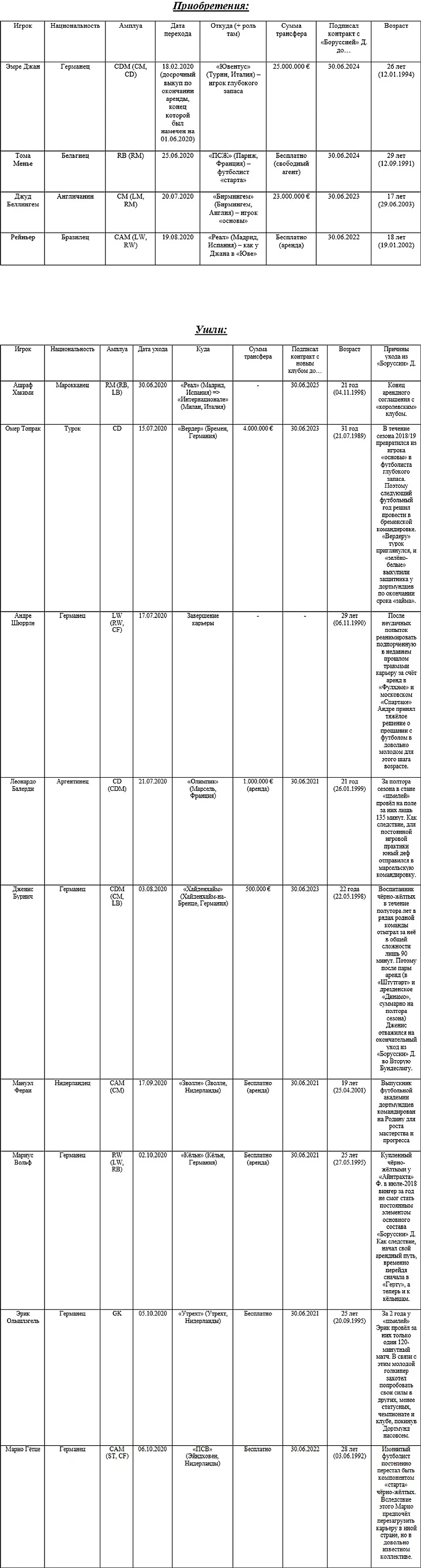 Не последнюю роль в поддержании «Боруссии» на высоком уровне играет и трансферная деятельность клуба. Даже в нынешнее, тяжёлое во всех отношениях, время руководство команды сумело сделать ряд отличных покупок и с пользой расчистить состав. Доказательство тому – работа «шмелей» на футбольном рынке в июне-октябре 2020-го: