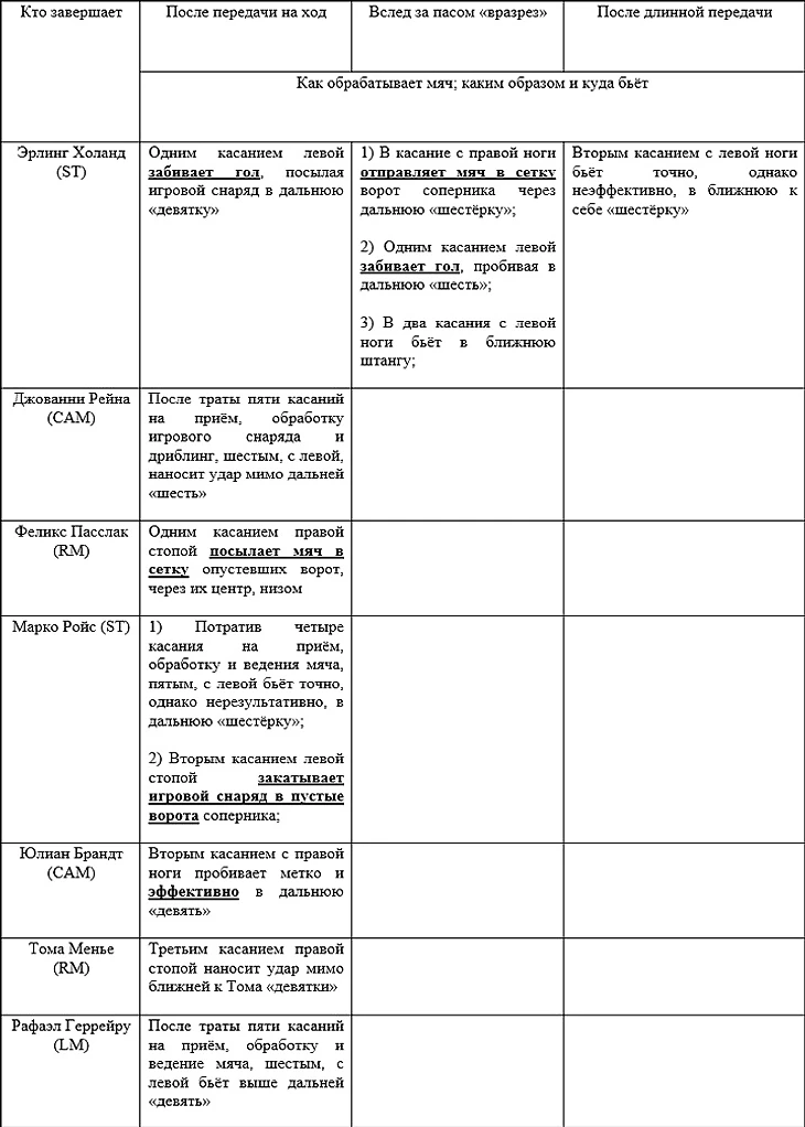 На треть реже и совершенно неэффективно «шмели» атакуют благодаря дальним ударам по воротам визави. Лишь каждый второй из подобных «выстрелов» попадает в створ, голов же при этом совсем не наблюдается. Более половины из данных ударов (с 60%-ной меткостью благодаря Акселю Витселю и Беллингему) приходится на позиционные наступления чёрно-жёлтых. Четверть – случается в процессе их контрвыпадов, усилиями Холанда и Рейны (каждый второй раз – точно, за счёт Джованни). Абсолютно эпизодически (и совершенно не в створ) стараниями Брандта немцы бьют с дистанции, подбирая мяч после ошибок обороняющихся оппонентов. Подробности относительно конкретных точек, с которых наносятся все такие удары, их меткости, успешности, персонализации и типов ситуаций, когда подобное происходит, можно узнать из следующих схем: