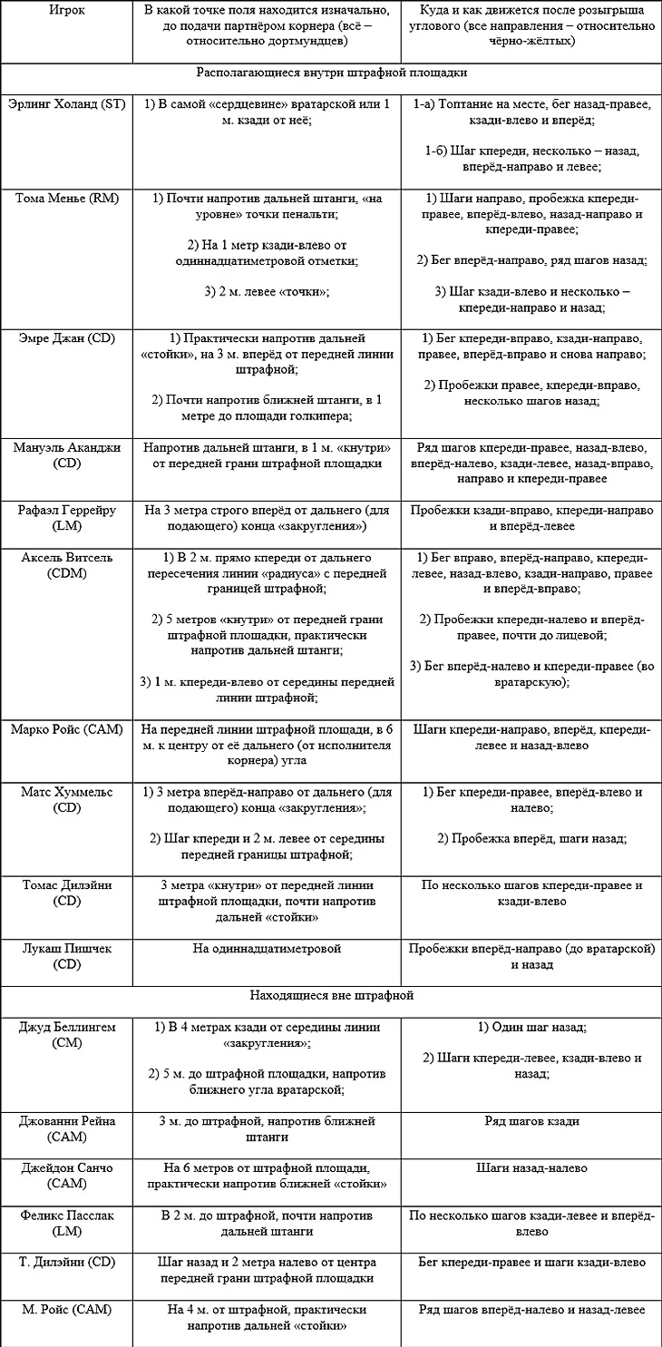 Довольно редко добиваются успеха «шмели» и при стандартных положениях. Хоть какой-то эффект для них имеют лишь корнеры. Среди оных только каждый седьмой заканчивается ударом по владениям противника. Но уже треть случаев из таких может ознаменоваться голом. Особенно, когда угловой подаёт Рейна, на Эмре Джана, при этом направляя мяч к «сердцевине» штрафной, в участок на два метра вперёд-левее (для команды Джованни) от точки пенальти. Оттуда Эмре получает шанс результативно пробить в дальнюю «девятку». Альтернативные варианты: навесы от угла поля в исполнении Юлиана Брандта и Санчо. №19 при этом метит в область на 1 м. кзади-направо от центра передней линии вратарской, выискивая пасом Менье. Джейдон же стремится подать на ближнюю штангу, в район на четыре метра назад-влево от соответствующего угла площадки голкипера, где игровой снаряд ждёт Лукаш Пишчек. Бельгиец и поляк в такие моменты целятся по верхним участкам ворот соперника. Только Тома – в дальний, максимум попадая в каркас, а Лукаш – по ближнему, точно, однако без успеха. В целом же чёрно-жёлтые до исполнения одноклубником рассматриваемого «стандарта» заранее обговорённым способом локализуются по обе стороны границ штрафной. Как правило 5-7 человек в ней и 1-3 – за пределами оной. Конкретика таких местонахождений и дальнейшие перемещения описываются в следующем инфоблоке: