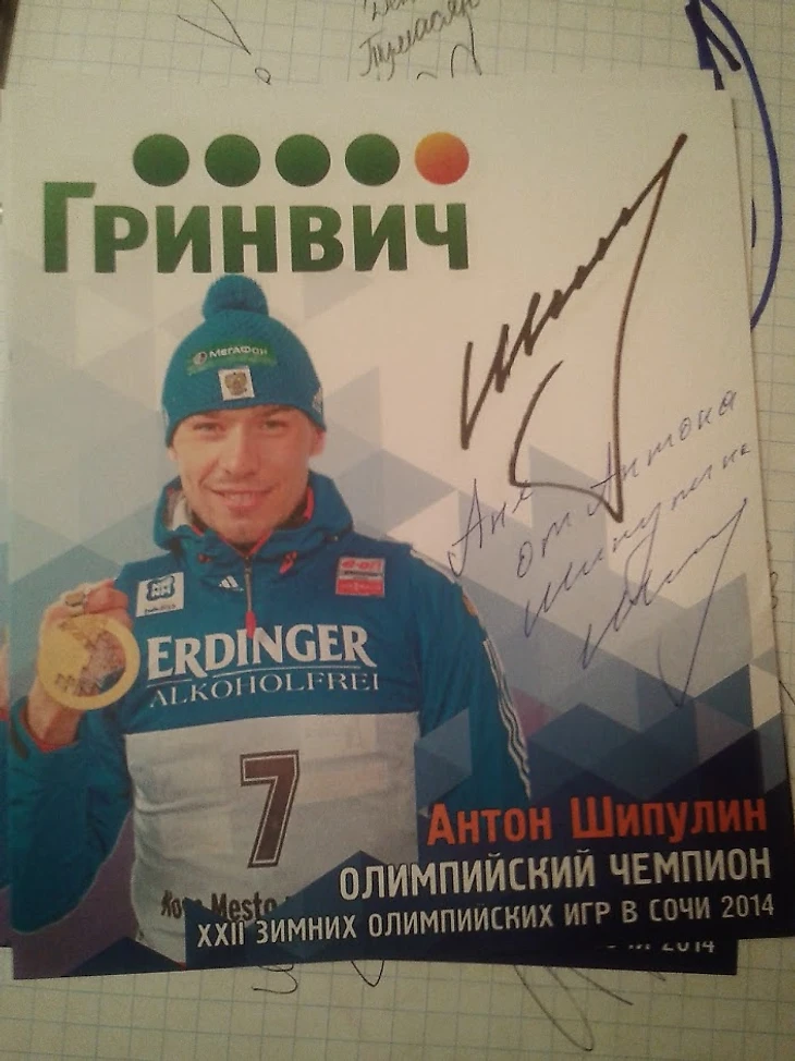 Именной автограф от Антона Шипулина. В конце февраля, практически сразу после ОИ в Сочи, Антон провел встречу со всеми желающими болельщиками в Екатеринбурге, где я смогла получить свой первый автограф биатлониста. Потом было еще несколько встреч, по итогам которых у меня на руках собралось приличное количество автографов Антона, но этот самый любимый, потому что именной )