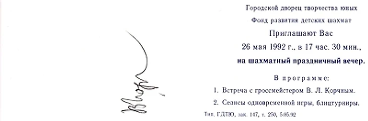 Это был май 1992 года, Корчной приехал в первый раз в родной город (уже Санкт-Петербург) после длительной эмиграции (в которой он был с 1976 года – года моего рождения). Естественно, интерес к визиту Корчного был огромный, мне удалось там взять у него автограф, а также сфотографировать его.