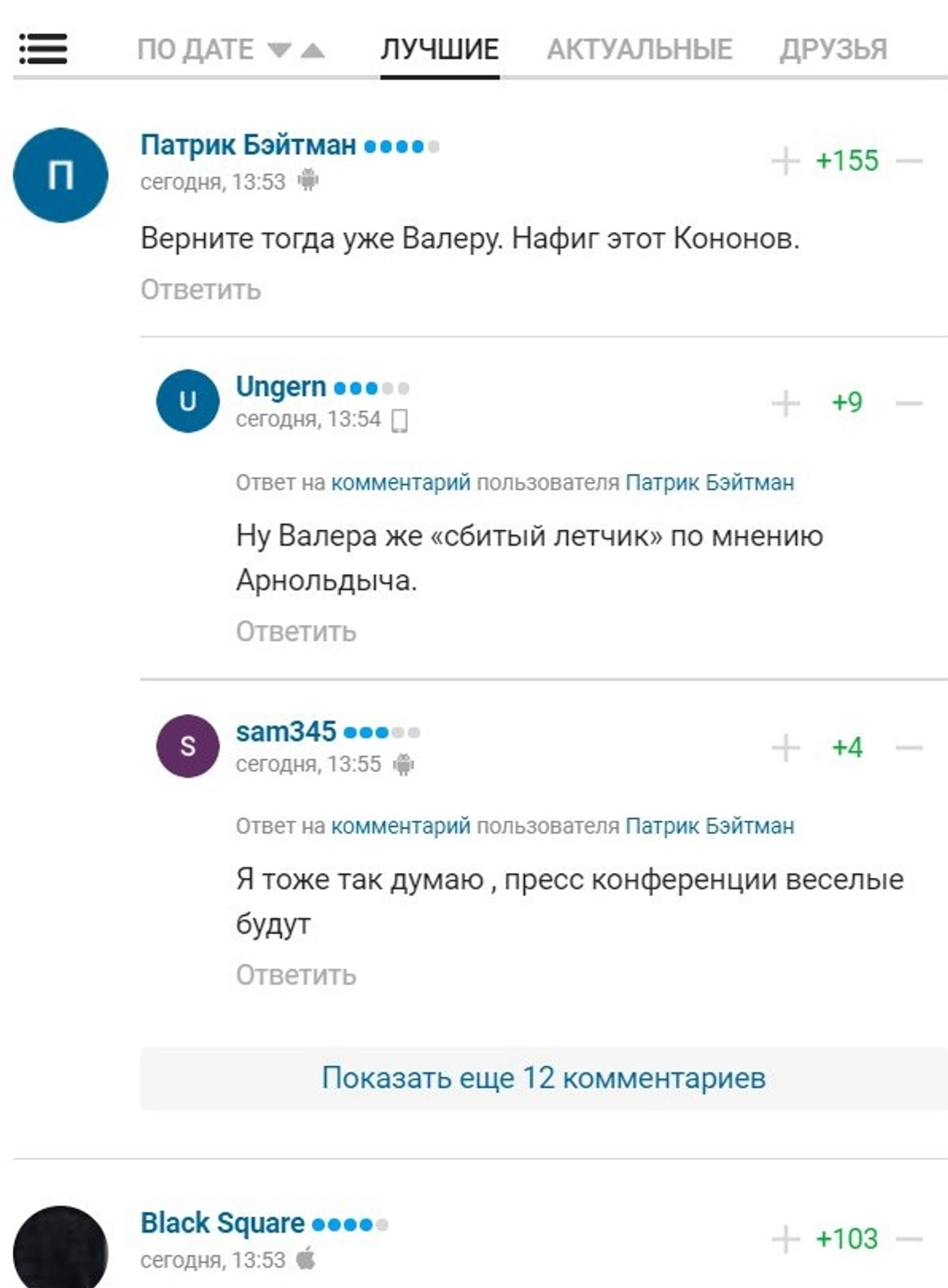 Так выглядит начало ветки по фильтру «Лучшее» с новым видом комментариев: