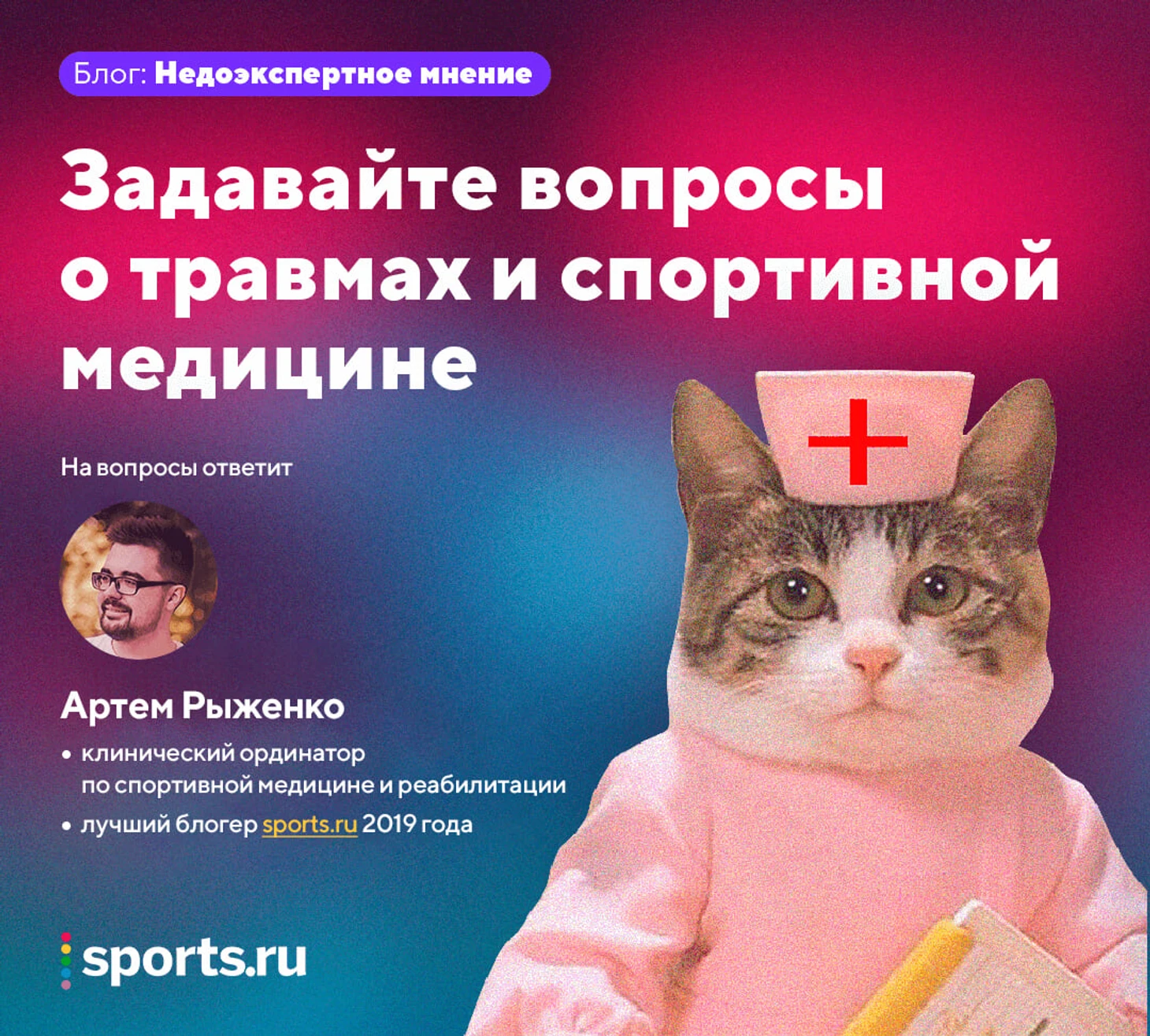 Мы отберем самые интересные вопросы, и на них отдельным постом ответит Артем Рыженко – клинический ординатор по спортивной медицине и реабилитации. Он ведет отличный блог, который Sports.ru признал лучшим в 2019 году. Подробнее про Артема и его профессию читайте тут.