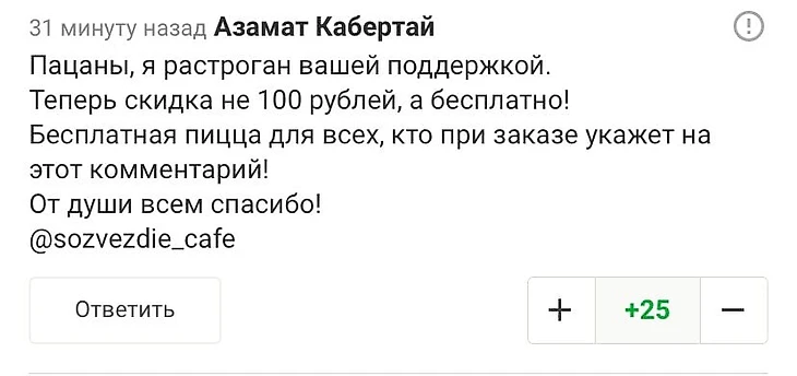 Мы разбанили Азамата и связались с ним. По словам владельца кафе, бесплатную пиццу заказали уже два пользователя нашего сайта из Краснодара!