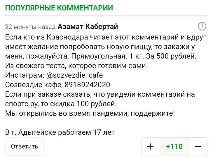 Азамат рассказал, что пользуется Sports.ru с 2016 года – в основном комментирует новости (и нет, про пиццу он написал только сейчас!). Он подтвердил, что скидка для пользователей Sports.ru все еще действует – если вы из Краснодара, можете глянуть контакты в инстаграме кафе.