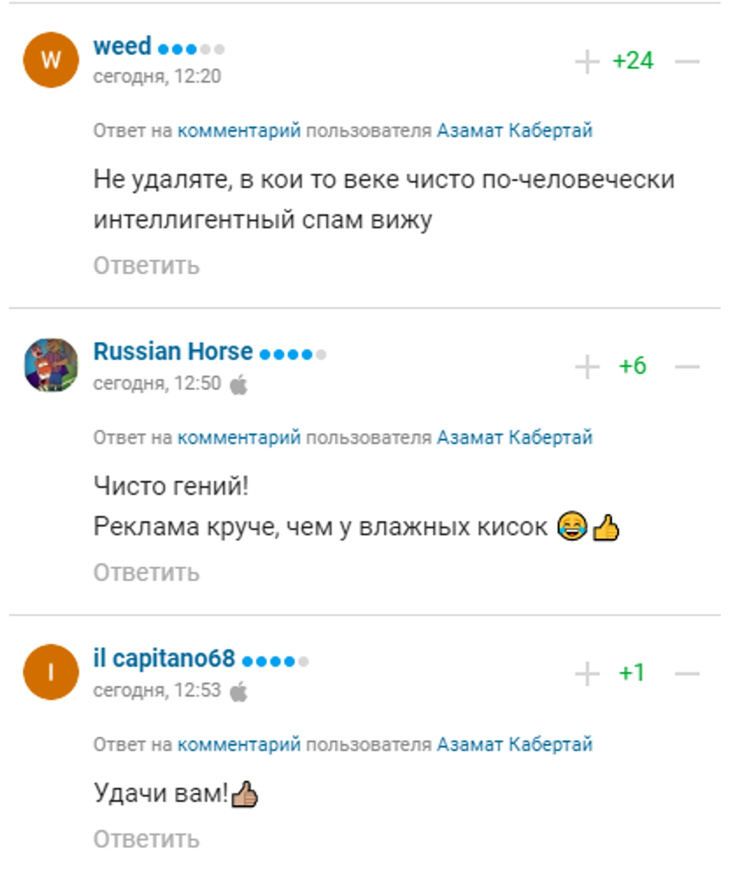 На Sports.ru запрещен рекламный спам, но в первую очередь мы прислушиваемся к мнению и реакции наших пользователей. Пользователи поддержали Азамата – и мы тоже попробуем.