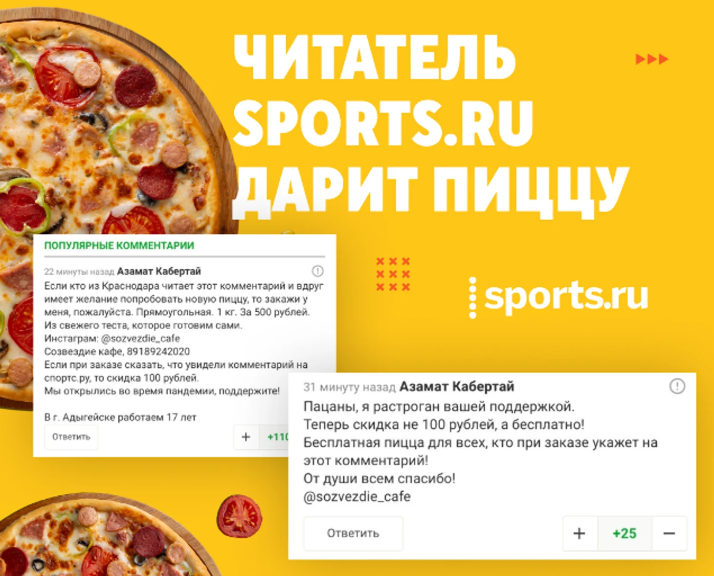 А Азамат (еще до блокировки) поблагодарил за поддержку и обновил условия акции: бесплатная пицца для всех пользователей Sports.ru из Краснодара, которые при заказе покажут скрин вот с этим комментом: