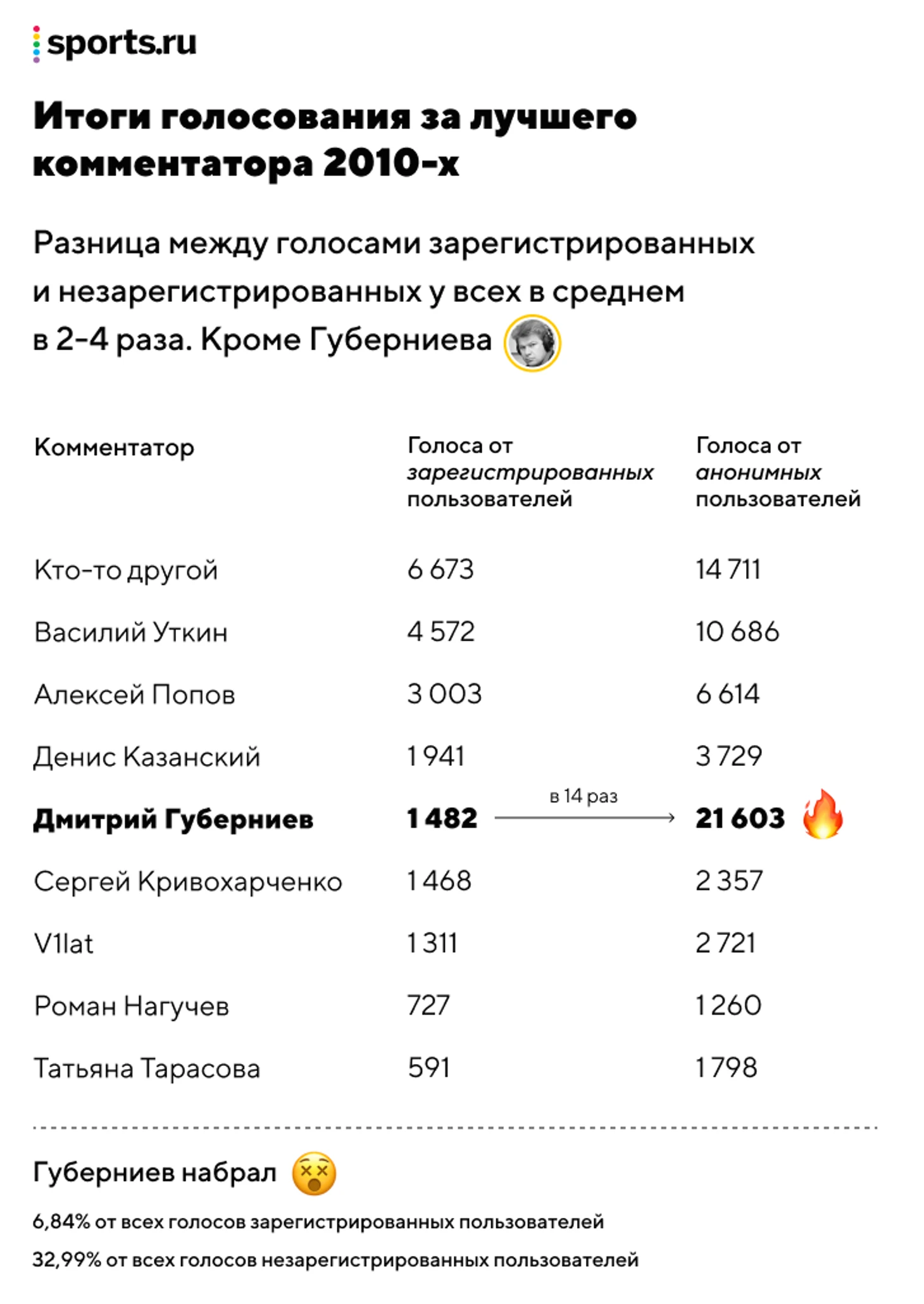 Но есть одна статистическая странность: за комментатора «Матч ТВ» очень активно голосовали незарегистрированные пользователи (21 тысяча голосов из 65 в этой категории, у второго места – 14 тысяч). Залогиненные пользователи Sports.ru активнее поддерживали вариант «кто-то другой»: 6,5 тысячи из почти 22, Губерниева выбрали только 1,5 тысячи.