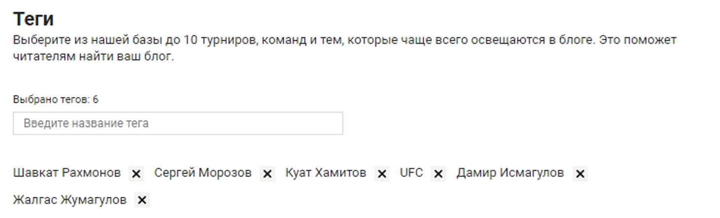 Не забудьте в разделе вид спорта выбрать «Казахстан» (в самом внизу списка) и добавить хотя бы один тег к своему блогу (тег – это турнир, клуб или тема из базы данных сайта, о которой вы планируете писать в своем блоге).