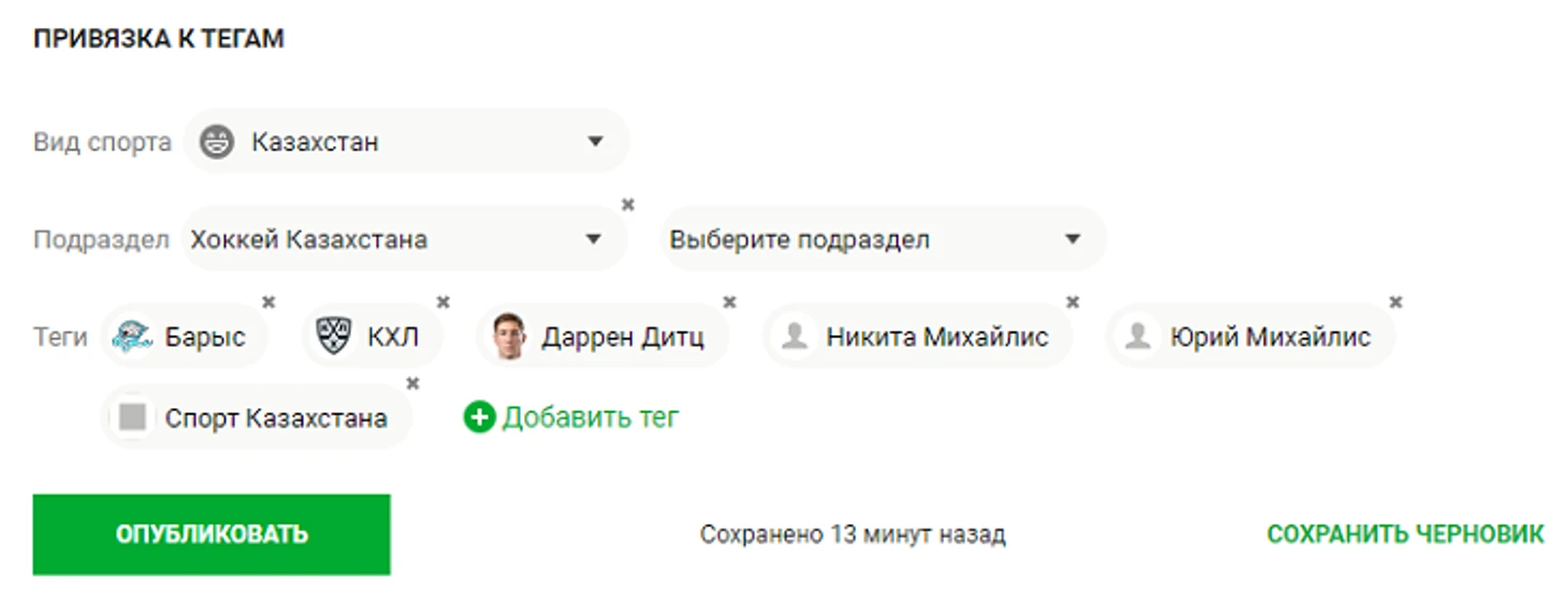 В поле ввода тега начинаете прописывать слово – имя спортсмена, название команды, соревнования. По введенным буквам вам будут предложены разные варианты – выбирайте тот, который вам нужен. Постарайтесь упомянуть максимальное количество персон, команд, событий, которые есть в вашем материале. Максимальное количество тегов – 10.