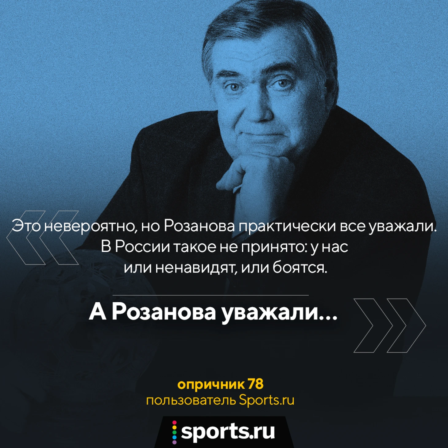 tatanych: «Я счастливчик. Довелось поработать с Розановым – правда, не на ТВ, а на радио Спорт ФМ в 2007-10 годах. Лучше него нет никого на комментаторском поле, всегда так считал и считаю. Человек высочайшей личностной этики и суперпрофессионал своего дела. Не чета нынешним. Вечная память и искренние соболезнования».