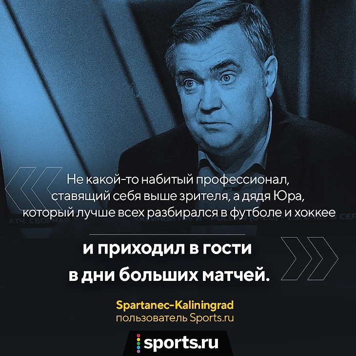 У него была удивительно четкая, эмоциональная, грамотная речь, во всех смыслах очень правильная. С ним ты не просто был зрителем, а сам принимал участие в матче. Спасибо за лучшие эмоции, Юрий Альбертович!»