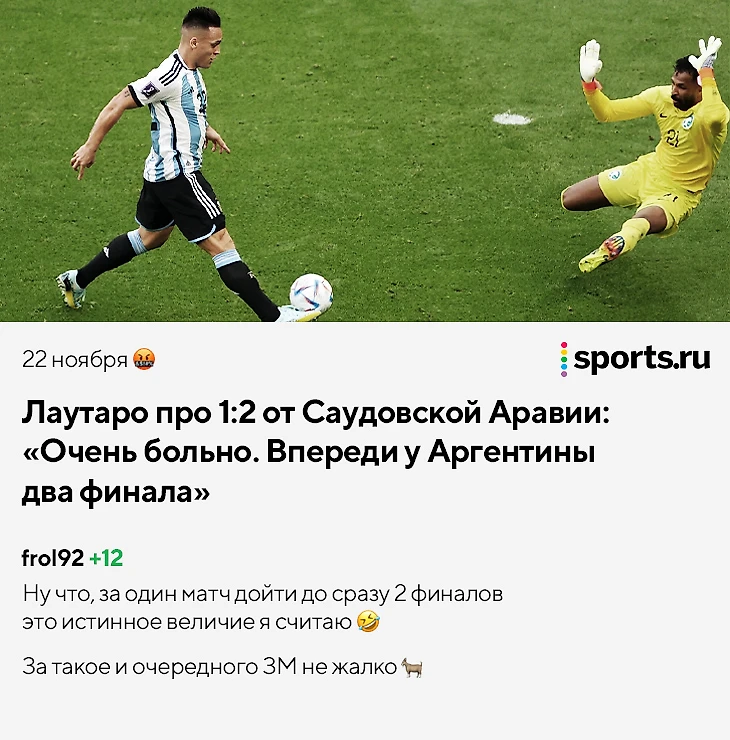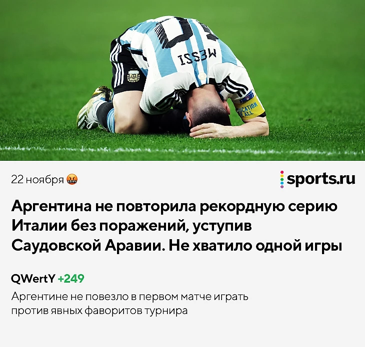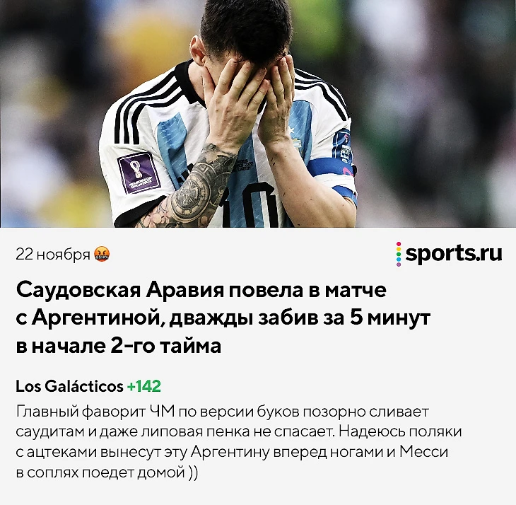 Сборная Аргентины − в финале чемпионата мира! Букмекеры и до начала турнира считали команду одним из фаворитов (второй после Бразилии), но первый матч многое изменил: Аргентина проиграла Саудовской Аравии (1:2), а Лионель Месси запомнился только голом с пенальти.