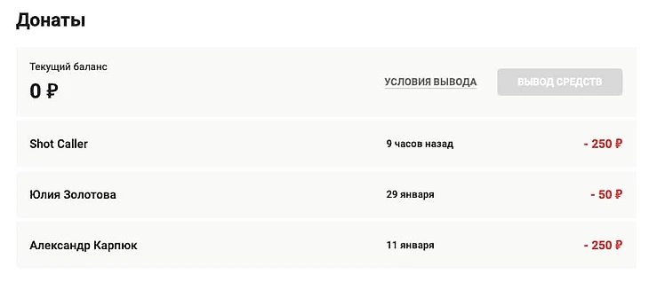 Минимальная сумма доната — 50 рублей, а вывода 300 рублей.