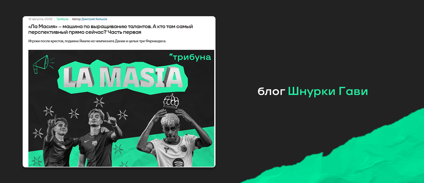 В блоге «Шнурки Гави» не живут воспоминаниями – только настоящее. Точнее даже будущее мирового футбола. В этот раз Дима заехал в Каталонию и задался сложнейшим вопросом: а кто самый талантливый в «Ла Масии» прямо сейчас? Пока Ламин Ямаль бежит к «Золотому мячу», читаем про новое поколение Родригесов и Фернандесов.