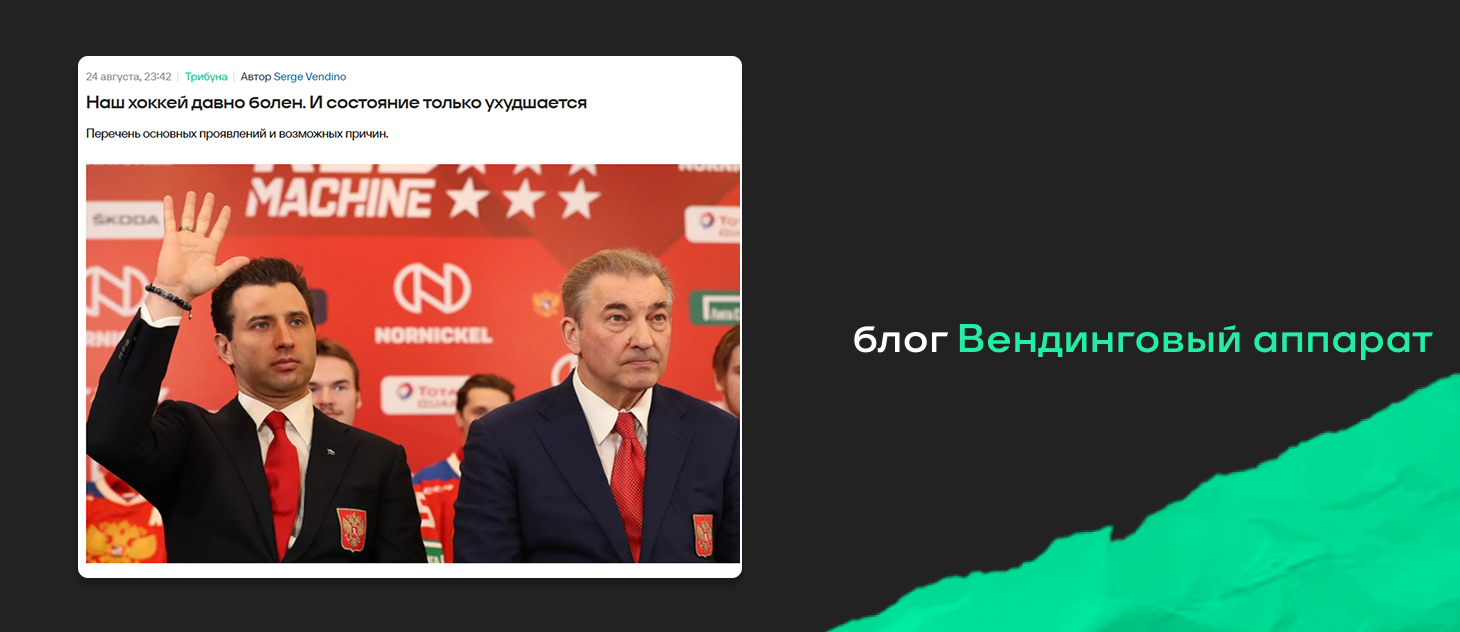 Завершает подборку лучших текстов месяца философский разговор о российском хоккее. Летом возникло огромное количество инфоповодов, и почти все граничили со скандалами. В блоге «Вендинговый аппарат» разобрались с происходящим, собрали больше 100 плюсов и запустили жаркую дискуссию. Присоединяйтесь!