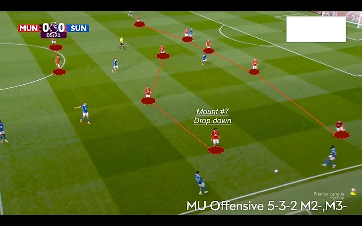 Один из самых частых паттернов атак «МЮ» — длинный заброс от Ламменса. Шешко тянет за собой центрального защитника и продлевает мяч дальше, а Мбемо врывается в свободный коридор. Схема проста, но работает — точно так же команда вскрывала «Челси», когда удалился Роберт Санчес.