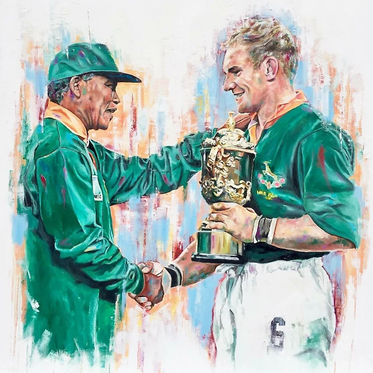 ... а также знаменитые сцены из регби - хака новозеландцев, вручение Нельсоном Манделой в 1995 году Кубка мира капитану сборной ЮАР Франсуа Пиенаару, и, конечно, невероятный момент из 1997 года, когда во время хаки новозеландцев хукер англичан Ричард Кокерил максимально близко подошёл к Норму Хьюитту - сильный момент!