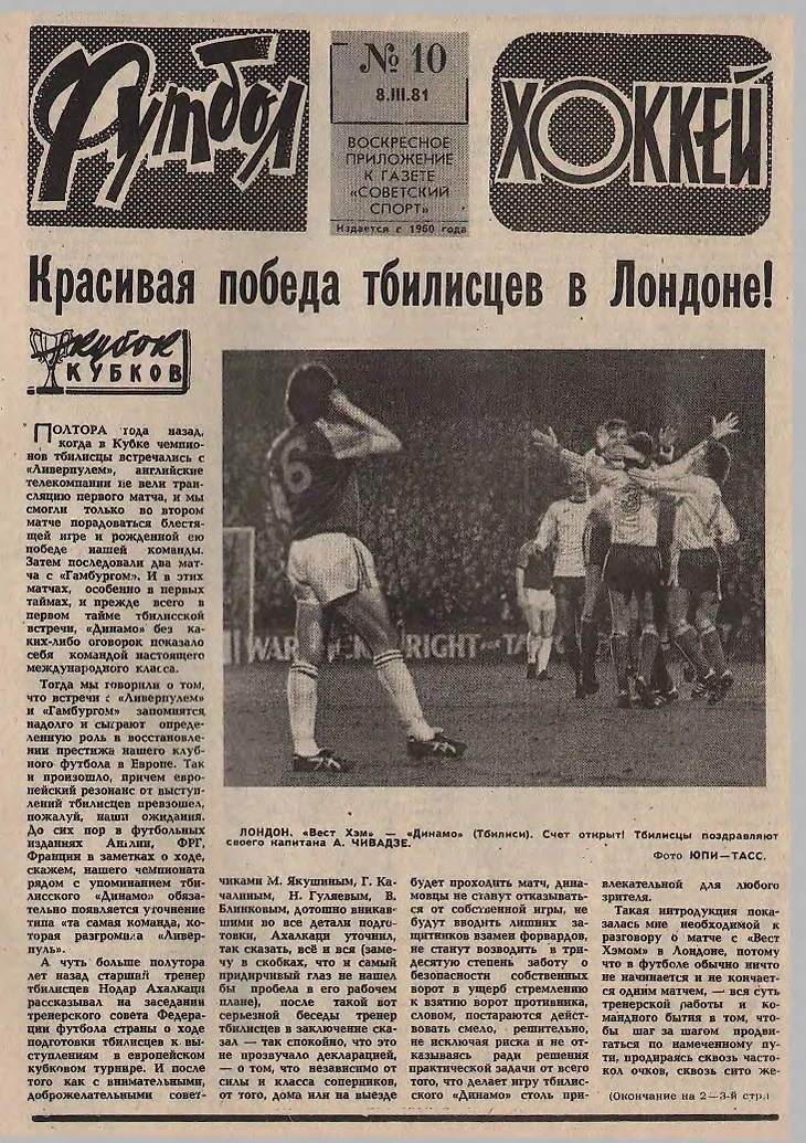 Тбилисские динамовцы в четвертьфинале Кубка кубков вынесли в Лондоне «Вест Хэм» – 4:1!