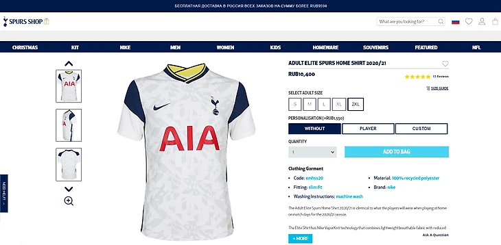 «Тоттенхэм», как и «Арсенал» встречает аналогичной надписью и так же ценами в рублях. Игровая футболка стоит 10 400 руб., персонализация – 1 550 руб., патчи – 1 050 руб. В итоге вся футболка стоит ровно 13 000 руб.