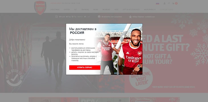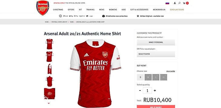 Доставка в Россию осуществляется за 10-18 рабочих дней (924 руб.) или экспресс-вариант за 2-3 рабочих дня (3 174 руб.). В результате за футболку «Арсенала» нужно заплатить 13 439 руб. со стандартной доставкой и 15 662 руб. с экспресс-доставкой.