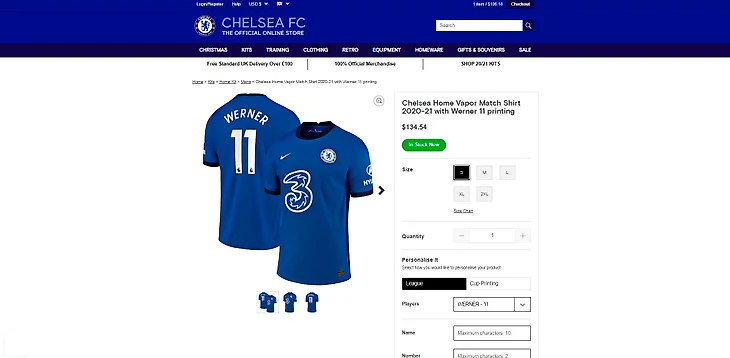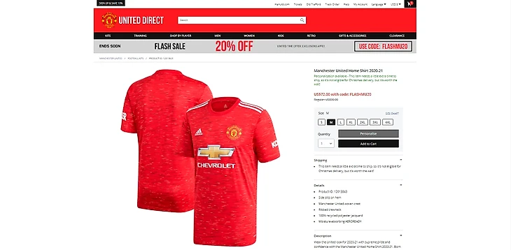 «Манчестер Юнайтед» на своей интернет-витрине предлагает только реплики игровых футболок (или их надо как то сильно искать). Футболка стоит 6 598,4 руб., но сейчас продает со скидкой за 5 278,72 руб. (скидка предлагается по промо-коду, который везде указан на сайте фан-шопа и не распространяется на третий комплект формы). Персонализация стоит 953,1 руб., патчи – 513,21 руб. В итоге футболка выходит 8 064,7 руб без скидки и 6 745,03 руб по промо-коду.
