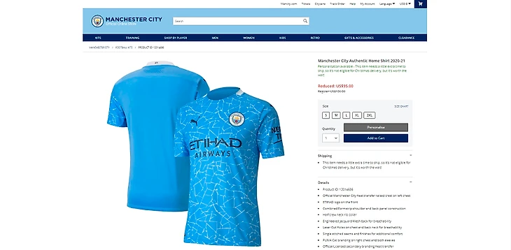 «Манчестер Сити» свои игровые футболки продавал за 9 970,91 руб., но на данный момент в фан-шопе распродажа и джерси можно урвать за 6 964,97 руб. Персонализация стоит 1466,31 руб. Нарукавные патчи – 513,21 руб. Вся футболка в сборе будет стоить 11 950,43 руб. по обычной цене и 8 944,49 руб. в период распродажи.