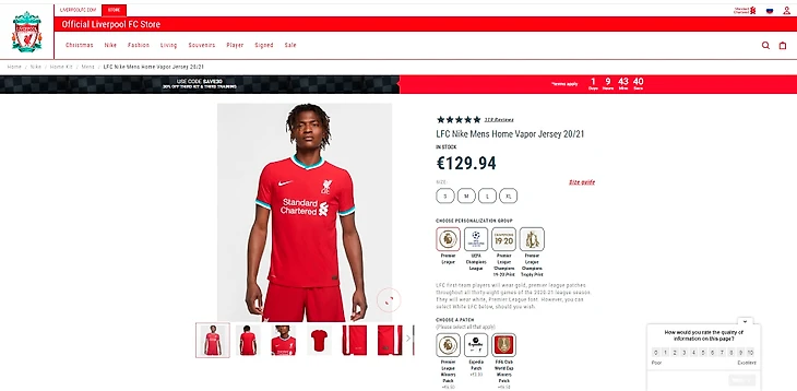 «Ливерпуль» продает свои джерси за 11 672,02 руб., а версию ЛЧ (в комплект входят нашивки ЛЧ) за 13 423,63 руб. Персонализация стоит 1 751,61 руб. к обычной версии и 1 167,74 руб. к версии ЛЧ. Патчи в обоих случаях стоят 1 167,74 руб. В итоге футболка «Ливерпуля» стоит 14 591,37 руб. за версию с патчами АПЛ и 16 342,98 руб. за версию ЛЧ. Доставка в Россию бесплатная, но не указано в какой срок.