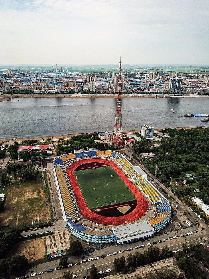 Стадион «Амур» в Благовещенске. На противоположном берегу Амура – китайский город Хэйхэ. Благовещенск и Хэйхэ разделяет 550 метров водной глади: между городами действует безвизовый режим.