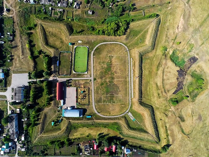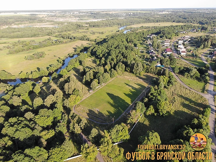 Стадион «Литейщик» в поселке городского типа Любохна Брянской области. Здесь проводит домашние матчи футбольный клуб «Металлург-Триумф». За деревьями течет река Болва – левый приток Десны.