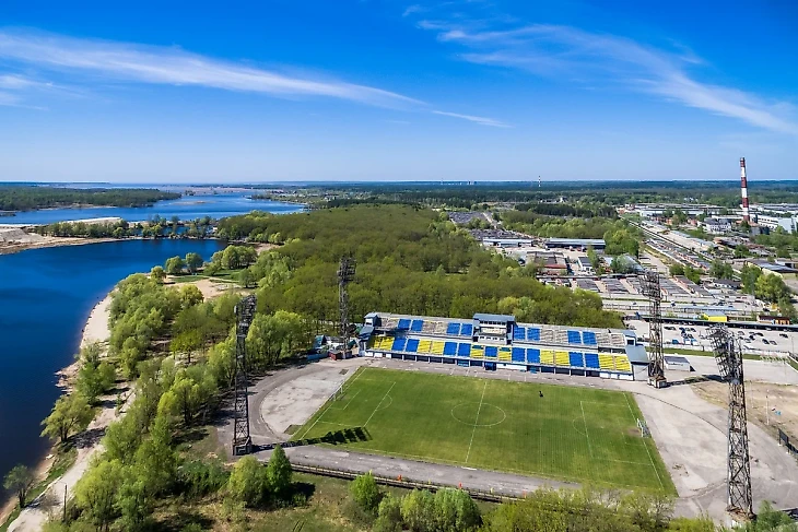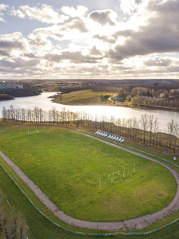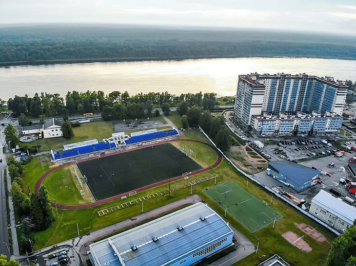 Стадион имени Юрия Андреевича Морозова в городе Кировск Ленинградской области. На дальнем плане – река Нева. Арена расположена в 10 километрах от истока Невы – Ладожского озера.