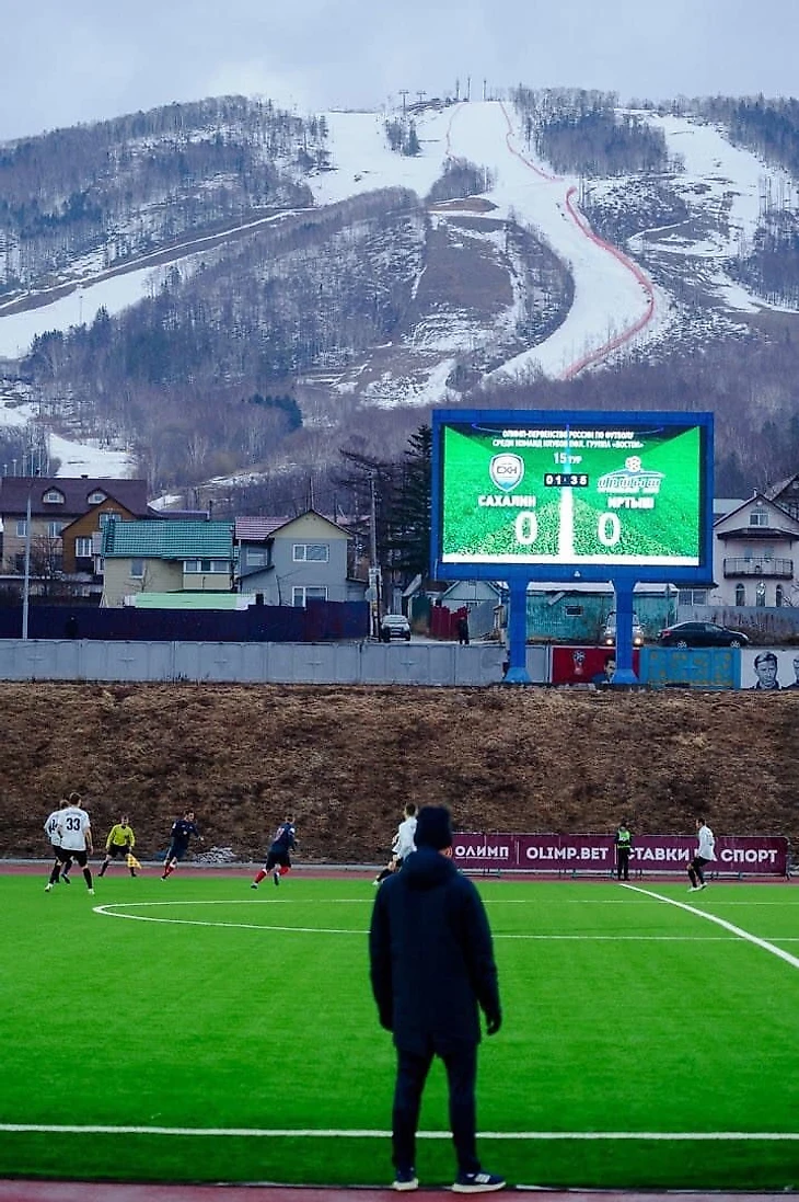 Вид на горнолыжный курорт «Горный воздух» с тренерской скамейки стадиона «Спартак» в Южно-Сахалинске.