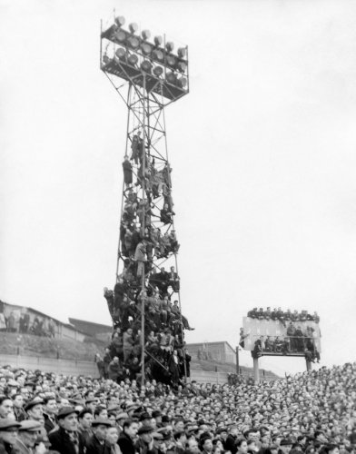 Чтобы посмотреть игру своей команды против Ньюкасла, болельщики лондонского Миллуолла разместились на прожекторе, 1957 г.