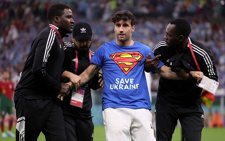 Вы же успели заметить человека, который выбежал на поле в матче между Португалией и Уругваем? Мужчина выбежал на поле с ЛГБТ флагом и в футболке, на которой были надписи "Спасите Украину" и "Свободу иранским женщинам".