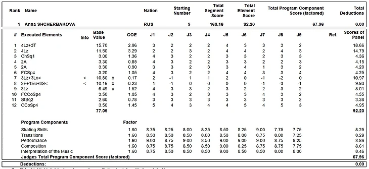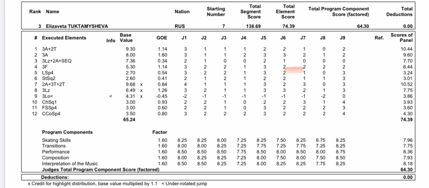Тот случай, когда японский, китайский и казахстанский судьи ставят Лизе 143-145,62 баллов (и самые высокие ГОЕ на элементах, причем заслуженные), а российский - 139,2 балла (и низкие, где-то средненькие, ГОЕ). И лишних слов не нужно.