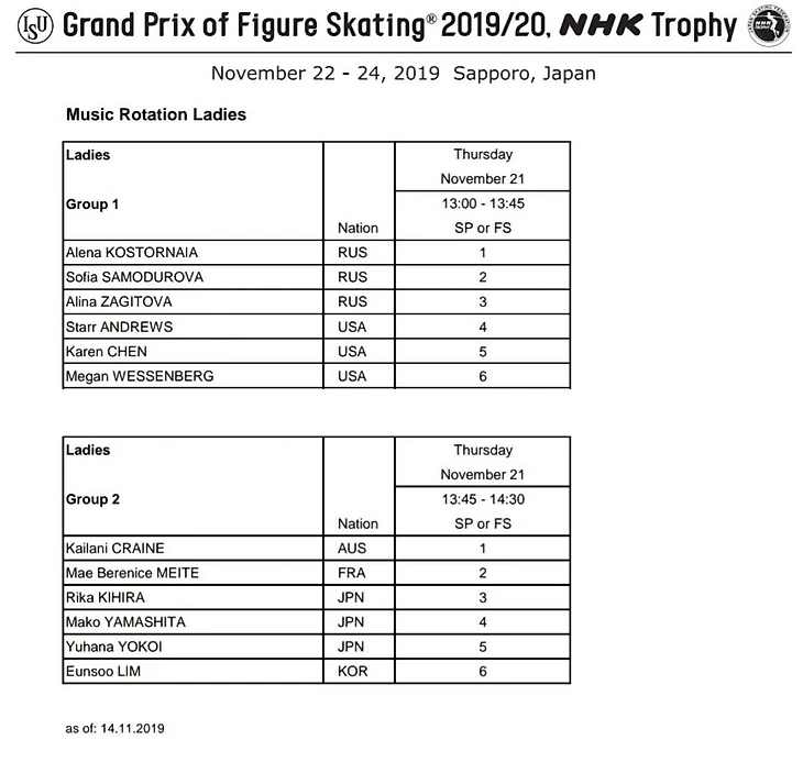 Расписание тренировочной разминки на NHK Trophy у девушек