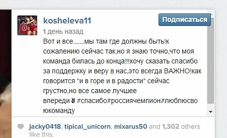 «Вот и все... Мы там, где должны быть. К сожалению, сейчас так, но я знаю точно, что моя команда билась до конца. Хочу сказать спасибо за поддержку и веру в нас, это всегда важно. Как говорится, «и в горе, и в радости». Сейчас грустно, но все самое лучшее впереди. #спасибо #Россиячемпион #люблюсвоюкоманду», – написала Кошелева на своей странице в инстаграме.
