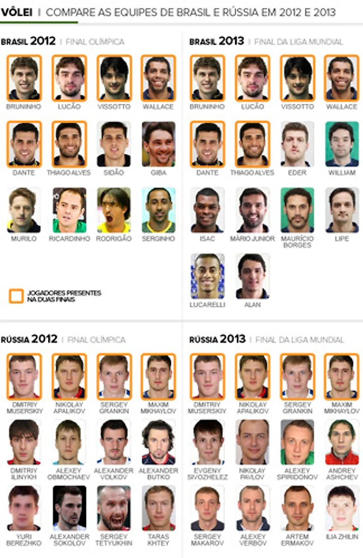1.15 Собственно, дотошные бразильцы, для которых волейбол значит не меньше. чем футбол, даже нарисовали подробную инфографику: «Как изменились команды по сравнению с 2012 годом». Как видим, у чемпионов мира в строю лучшая шестерка (Бруно, Лукас, Виссотто, Уоллес, Данте, Тиаго) + тренер Бернардиньо, который возглавляет сборную с 2001 года.