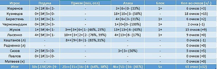 Вообще стоит сказать пару слов о тренере: практически на каждой игре можно заметить, что он не боится экспериментировать и даже не лишен определенного чувства юмора. На этой игре, для примера, он отправил бывшего диагонального Браво (а также их самого зрелого игрока) Дмитрия Радченко на пенсию на позицию второго либеро.