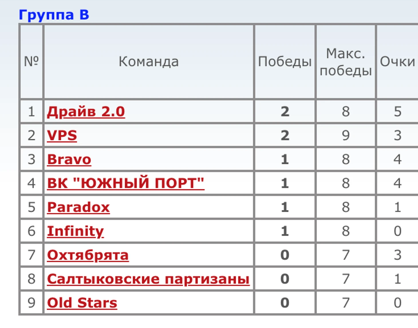 ВК "ЮЖНЫЙ ПОРТ" - Охтябрята: 3 - 2 (22:25, 22:25, 25:22, 25:20, 15:9)Встреча между ЮП и Охтябрятами была первой на прошлой неделе, но несмотря на это информации об игре нашлось мало. В целом игра прошла по похожему сценарию, как у Драйва с Парадоксом, первые две партии хозяева проиграли, потом со схожим счетом взяли 3 и 4 партии, и решилось все в пятом сете. Обе команды еще далеки от своей оптимальной формы и у обеих команд есть проблемы с посещаемостью игроками официальных игр. ЮП поднялся с 5 на 4 место, и отстает от Браво лишь по соотношению партий.
