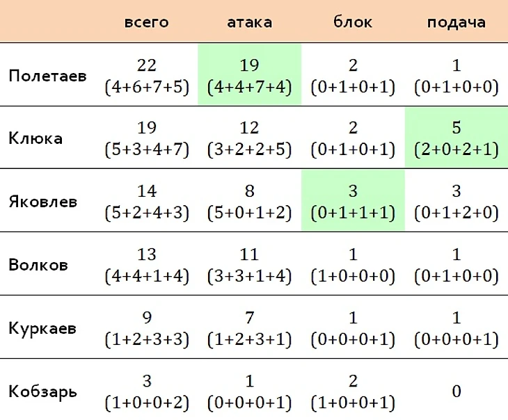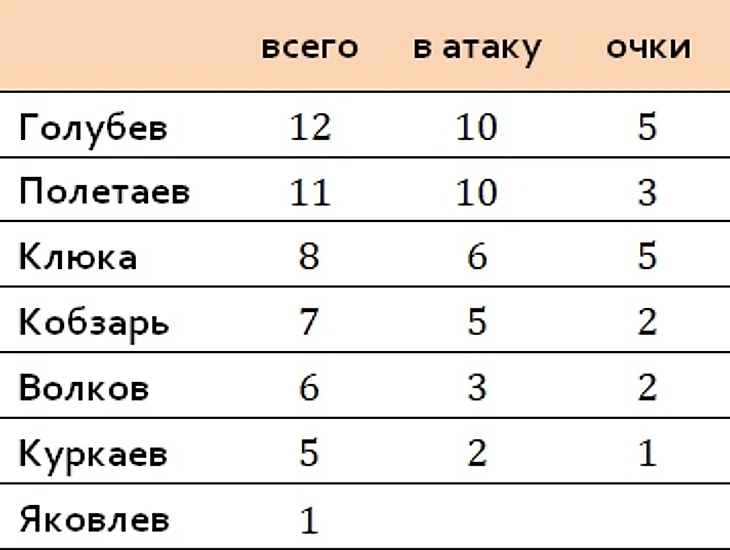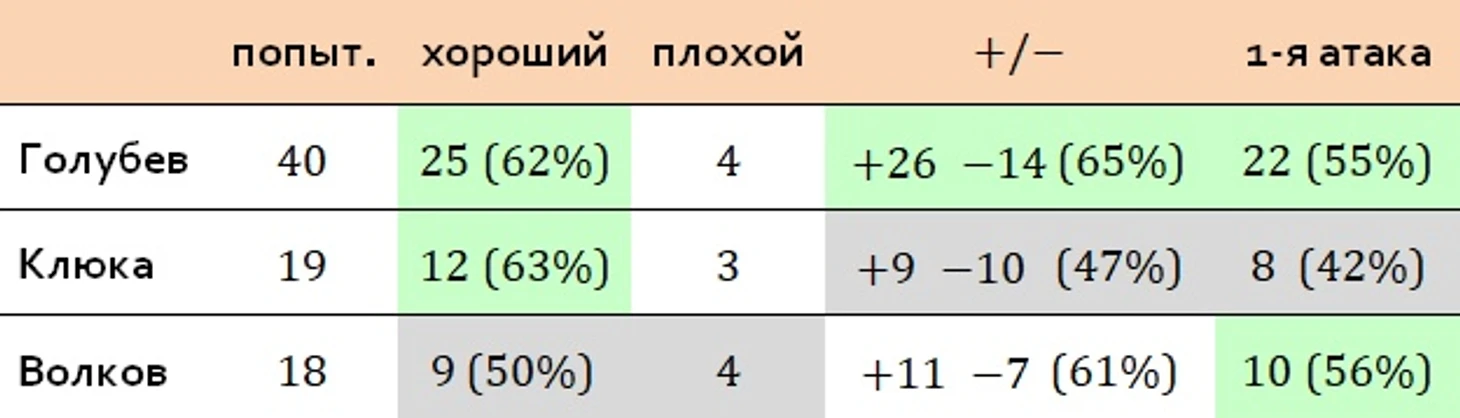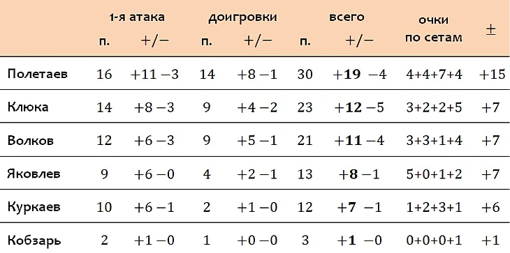 В этой встрече у нас был мегаполетаев, но любопытно, что в первой партии самым атакующим был не Витя: Ваня Яковлев получил 7 передач и заработал баланс +5–0. Во второй партии по 6 раз атаковали Полетаев и Клюка, но Егору больше всех дали с приёма: 4 паса. А вот в третьем сете Кобзарь уже загрузил Виктора по полной: 11 атак. В четвёртом самый атакующий опять Клюка: 10 попыток.