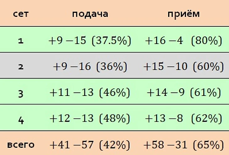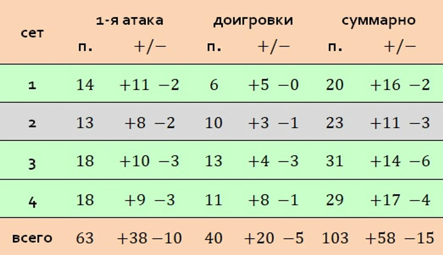 В целом это достаточно типичная сборная России, которая и сопернику отдаёт достаточно много брейковых очков, и сама лютует на подаче. Первый сет был даже слишком хорош (см. цифры в правой колонке). Чего не хватило во второй партии — из этой таблички не очевидно. Здесь чуть-чуть, там чуть-чуть — разберём позже, но всё-таки я скажу заранее, что больше просел наш приём.