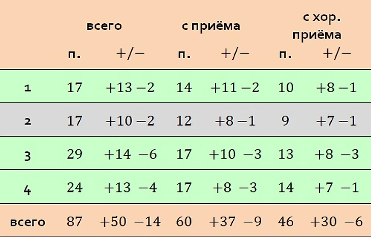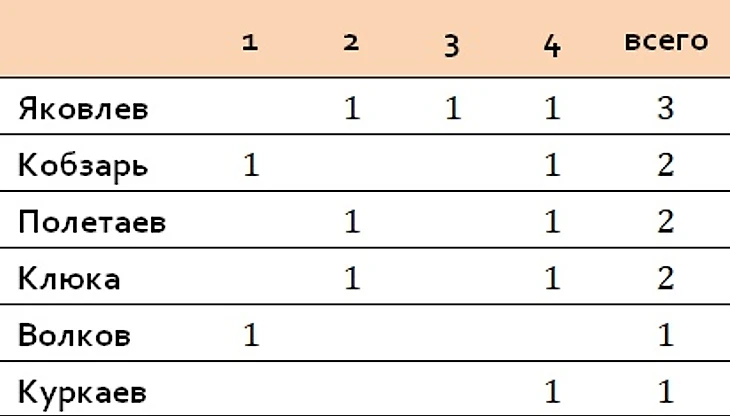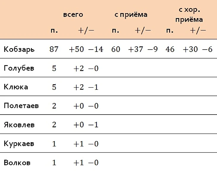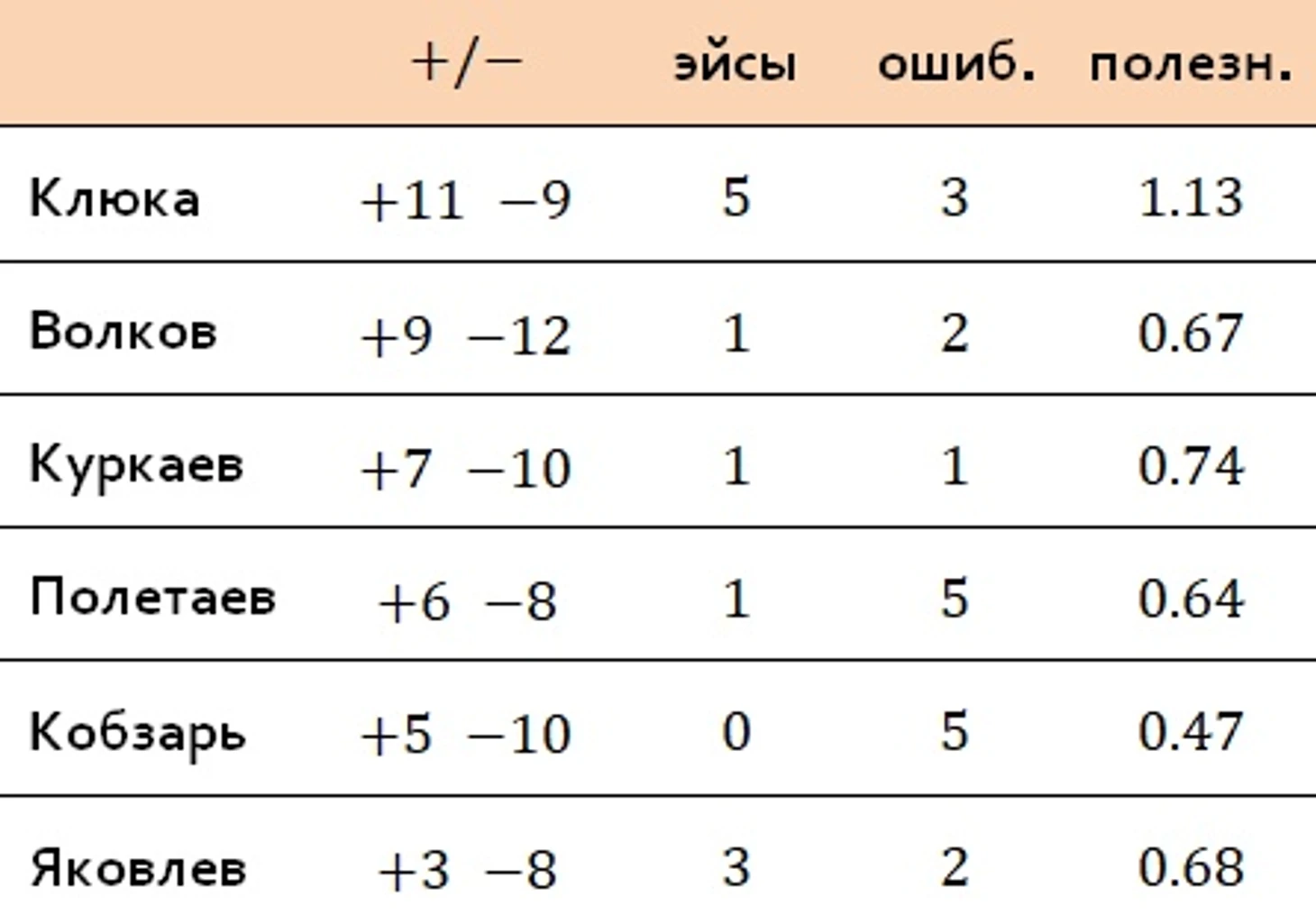Позиция Клюки очевидна. Но я позволю себе обратить внимание на то, что Куркаев стал вторым в команде по показателю полезности подачи (зря, что ли, я придумывал этот коэффициент). Да и у Яковлева он хороший (у Вани получилось забавно: все три брейковых очка — это его эйсы). А Полетаев действительно слегка недоподал (хотя +6–8 — это совсем само по себе хорошо).