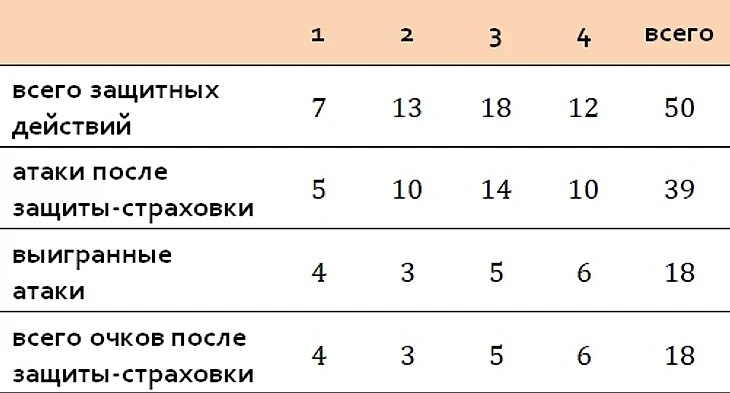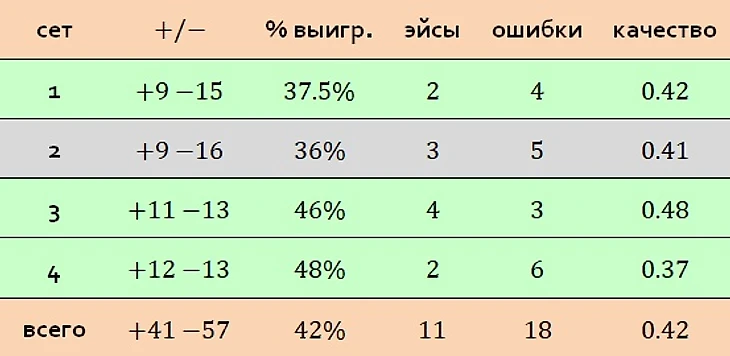 В этой табличке меня особенно радуют данные по четвёртой партии. Уверенно выиграть сет у соперника, который допустил всего одну ошибку (это была ошибка на подаче) — это здорово.