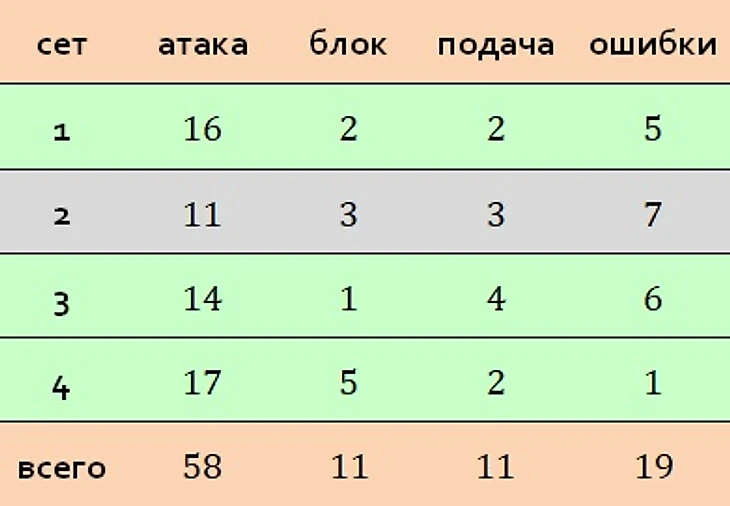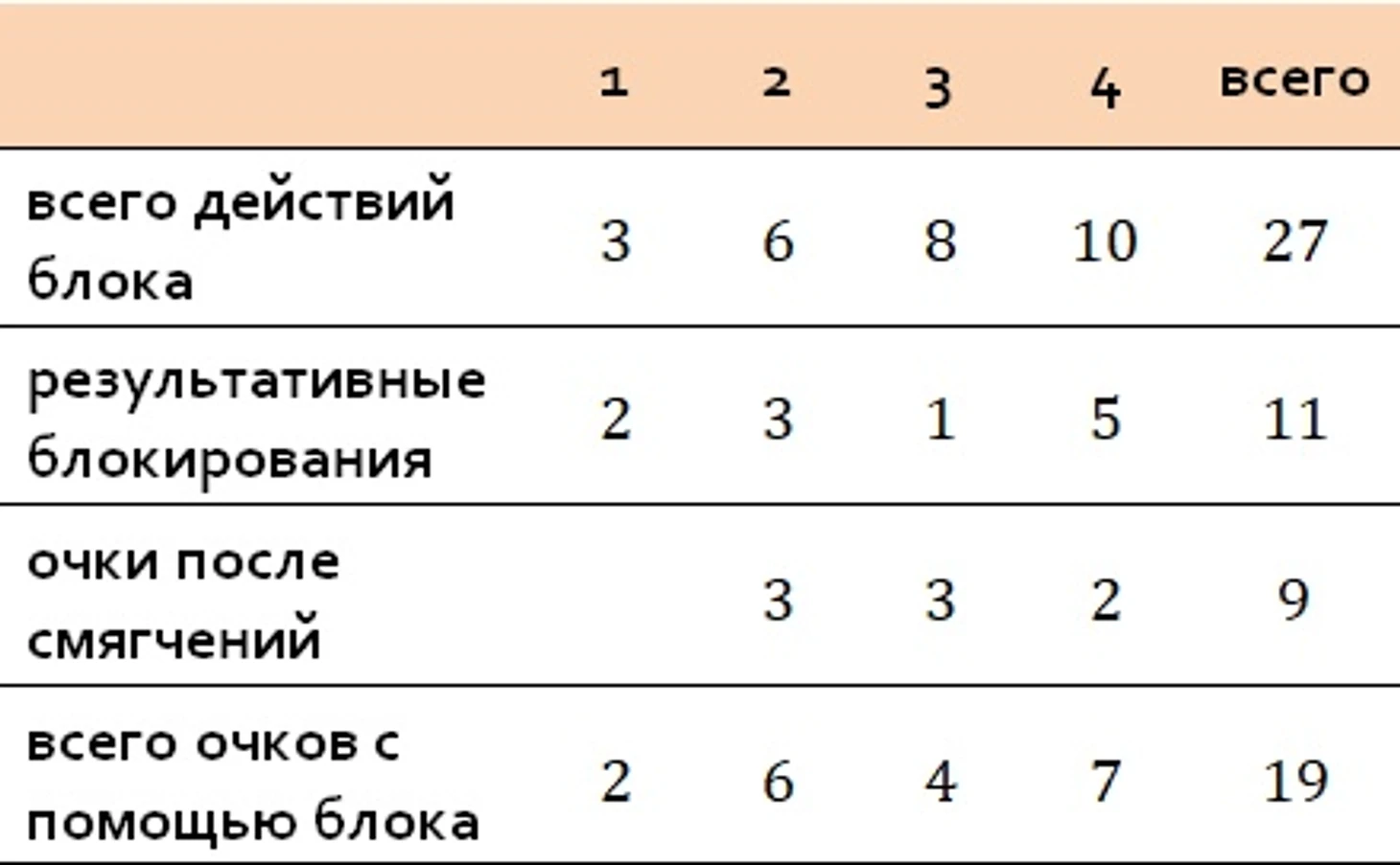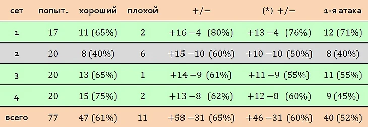 Цифры атаки неплохие даже в проигранной второй партии, а в первой и четвёртой — вовсе замечательные.