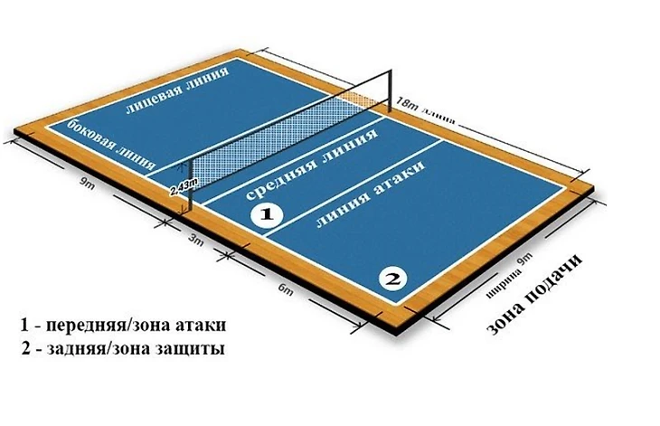 Площадка для игры делится сеткой на два равных квадрата. Каждая команда играет на своей территории. Цель игроков — чтобы мяч ударился об пол на зоне соперника. Все члены команды играют определенную роль и занимают одну из зон на корте. В процессе игры спортсмены меняют позиции.